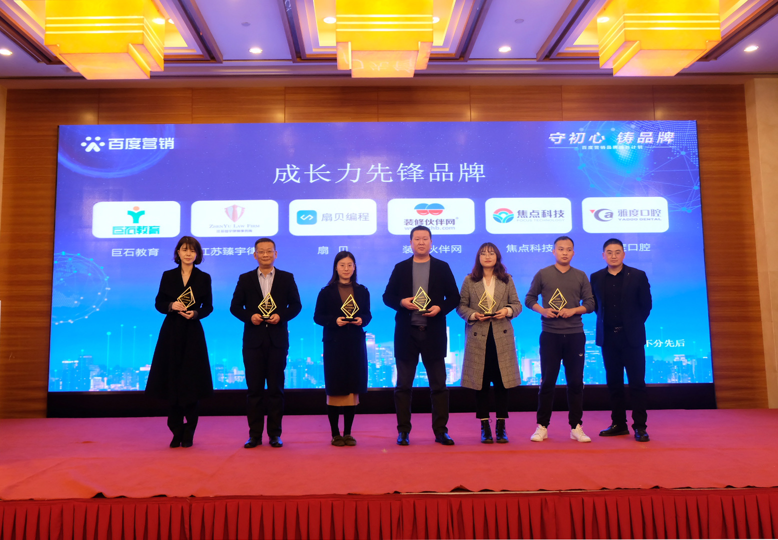 南京是一座歷史文化名城,同時也是一座創(chuàng)新名城,在創(chuàng)新的路上匯聚了眾多品牌力量。在發(fā)布會上,根據(jù)數(shù)據(jù)趨勢、百度搜索熱度排名等數(shù)據(jù),首屏百度營銷(南京)服務(wù)中心分別為巨石教育、焦點科技、扇貝、裝修伙伴網(wǎng)、江蘇臻宇律所、雅度口腔6家企業(yè),頒發(fā)“成長力先鋒品牌”榮譽獎項,以鼓勵品牌企業(yè)長遠(yuǎn)發(fā)展。